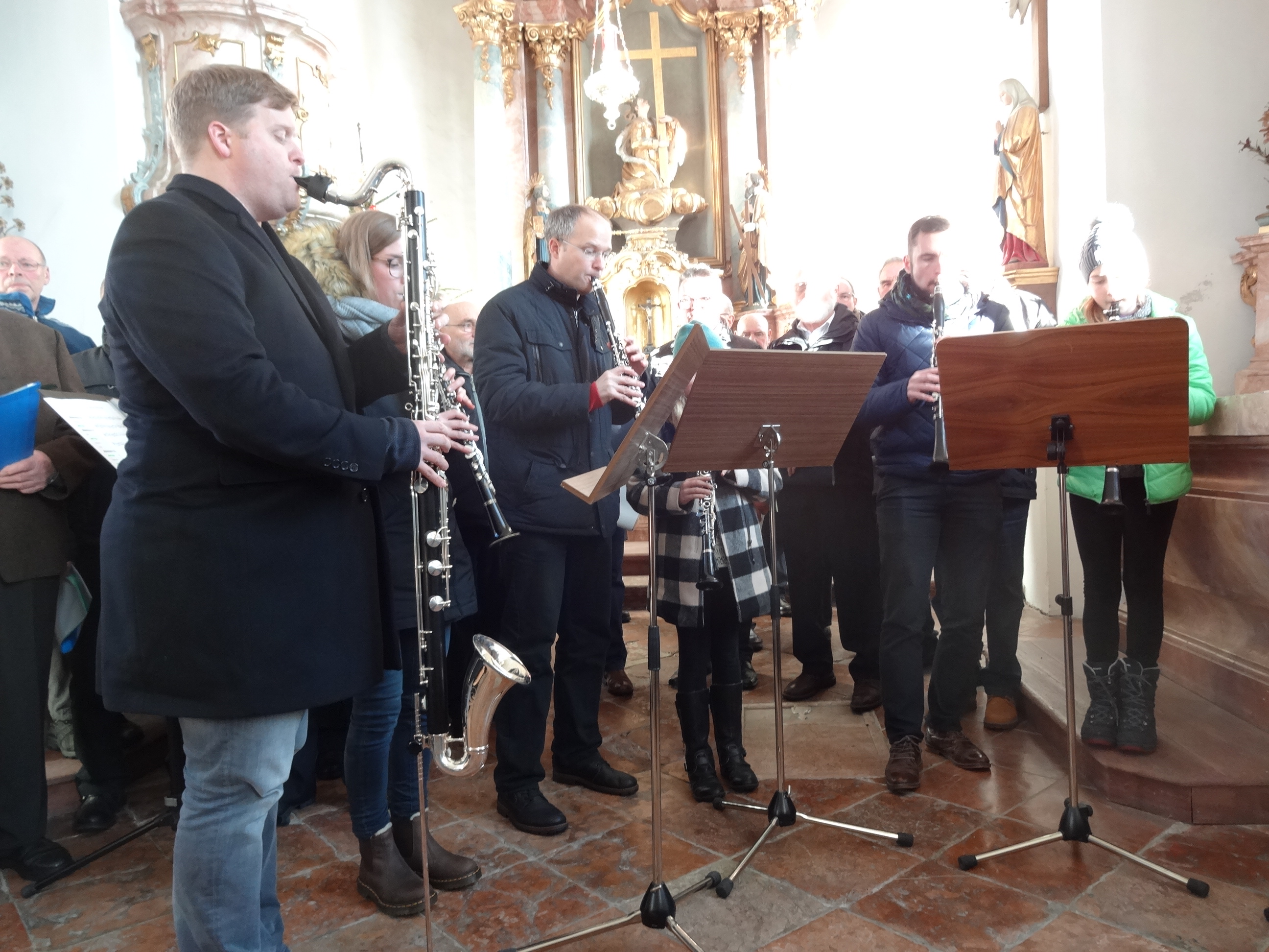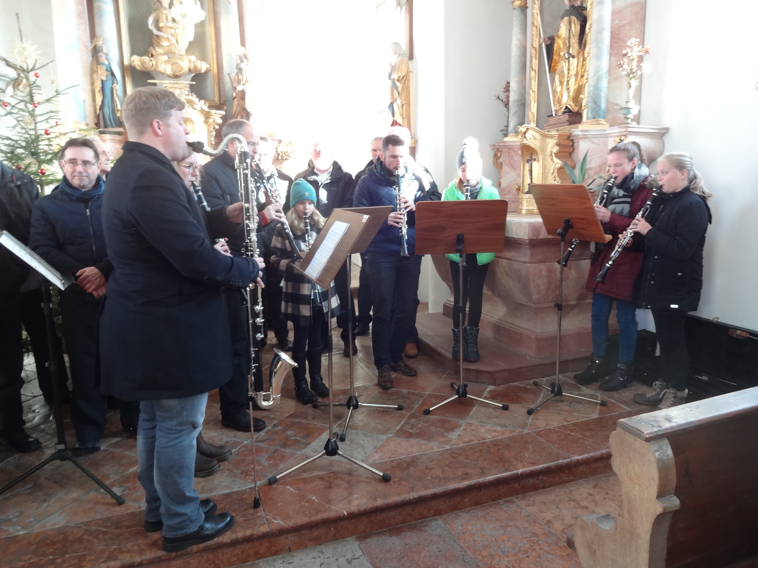 Peter und Tobias Kurz, die seit 1988 -also auch zum 30.Mal – die Krippenfeier mit ihrem Klarinettenspiel bereicherten, hatten neben Matthias Reheis auch den Nachwuchs aufgeboten: Fünf Mädchen, alle Mitglieder der Jugendmusik Kiefersfelden, zeigten gemeinsam mit den „Alten“ ihr Können an der Klarinette.
